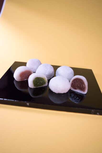抹茶餡とチョコ餡を羽二重餅で包んだ一口サイズの大福をチョコレートでコーティングしました。