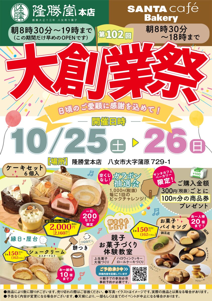 次の100年へ向けて、いっそう地域の皆様に喜んでいただける商品づくりとお店づくりに励んでまいります。 昨年、ご好評をいただいた「親子お菓子作り体験」を 今年は”上生・大福”と”ハロウィンクッキー・ロールケーキ”で開催! 「ガラポン抽選会」「縁日」「屋台」などのイベントや 「150円のお菓子バイキング」「お得なケーキセットの販売」など盛りだくさん! この機会にぜひ、お越しくださいませ。